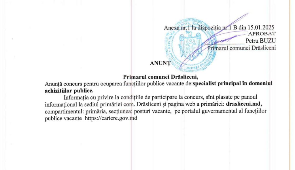 Anunț! Concurs pentru funcția de specialist principal în domeniul achizițiilor publice