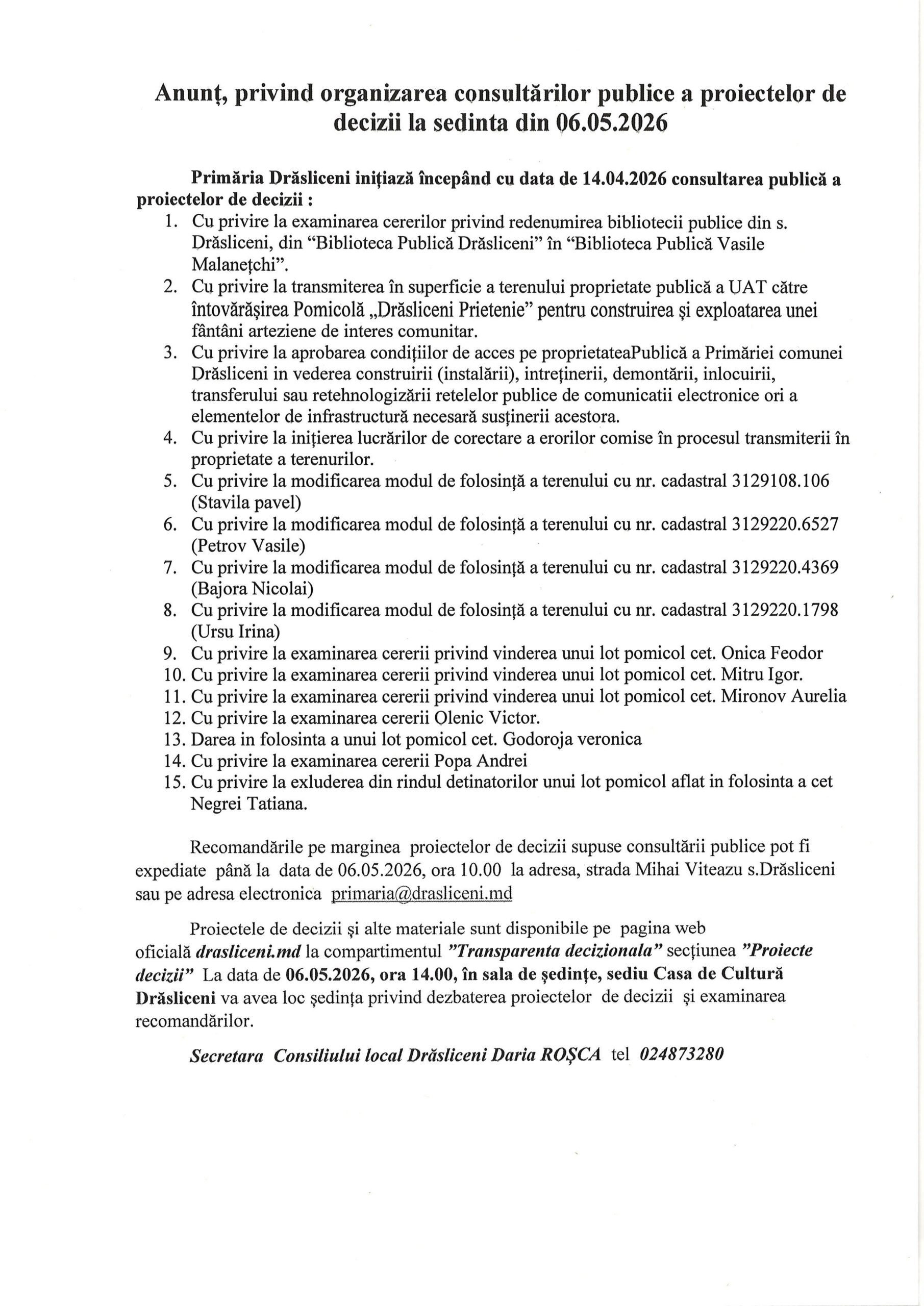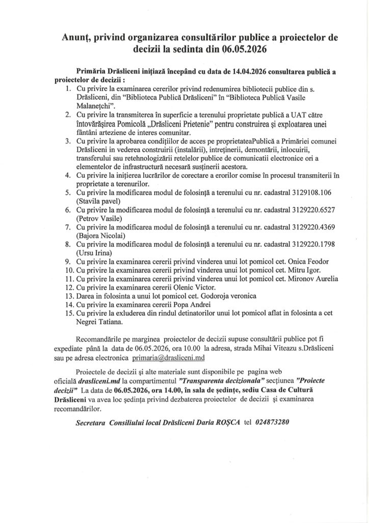 Anunț, privind organizarea consultărilor publice a proiectelor de decizii la sedinta din 06.05.2026