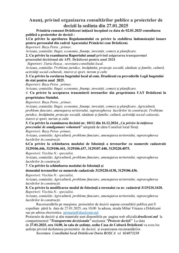 Anunț, privind organizarea consultărilor publice a proiectelor de decizii la ședința din 27.01.2025