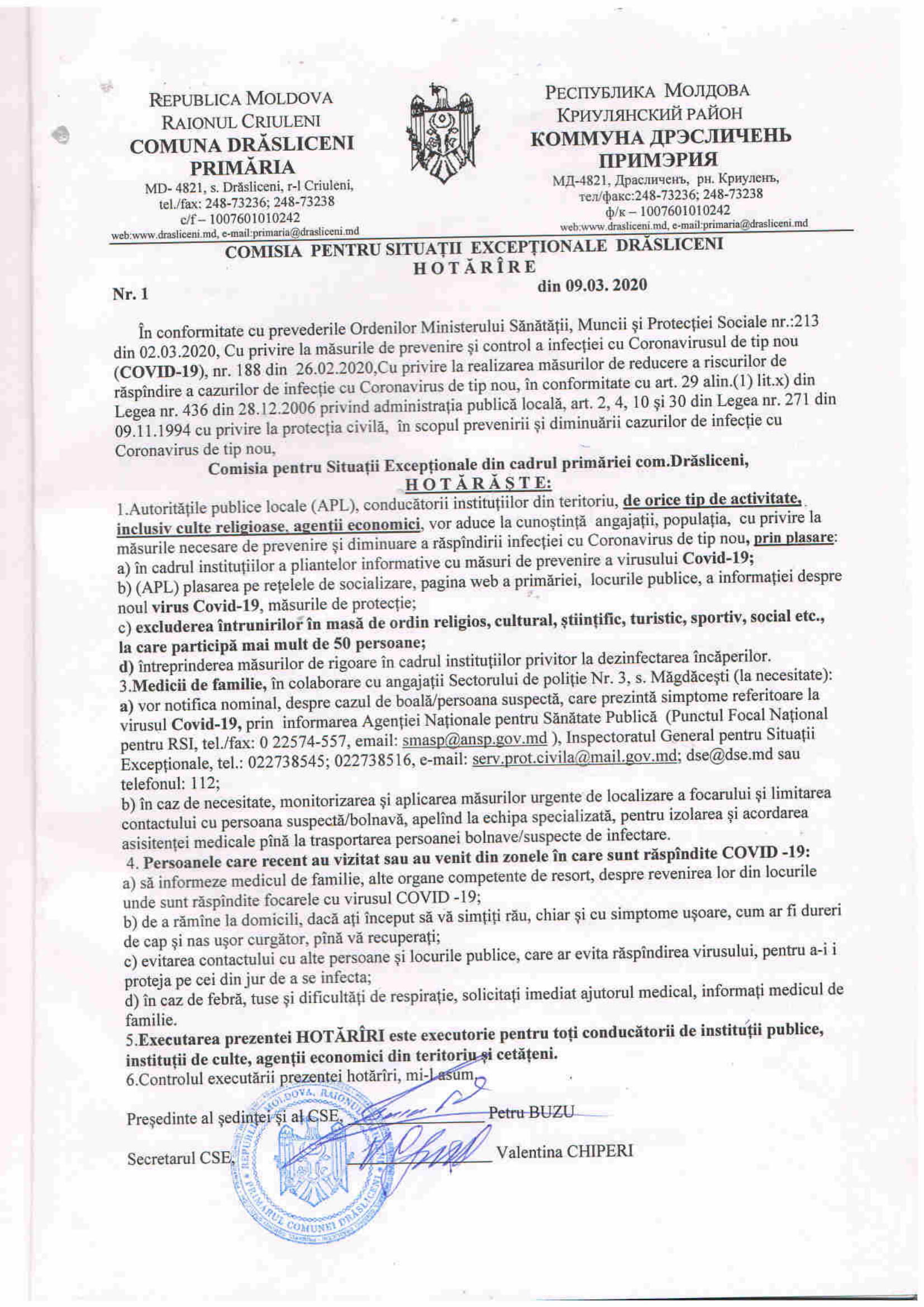 Hotărîre nr.1 din 09.03.2020 a CSE Drăsliceni